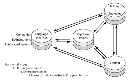 The project's analytical framework was organised around four sets of variables: language practices; representations of multilingualism and linguistic diversity; language policies implemented by the authorities and language strategies of private sector companies; and the linguistic environment in which actors operate. These four sets of variables influence each other in a number of ways, and the use and development of multilingual repertoires were studied not only through the variable sets themselves, but also through their interrelations.The empirical work took place on three terrains that have particular relevance for the management of multilingualism in Europe, namely, companies, EU institutions, and educational systems. The investigation of language processes on these three terrains was integrated through three transversal questions that arise on each of them. These are efficiency and fairness in language practices, the emergence of linguistic varieties, and patterns of multilingualism in European history.